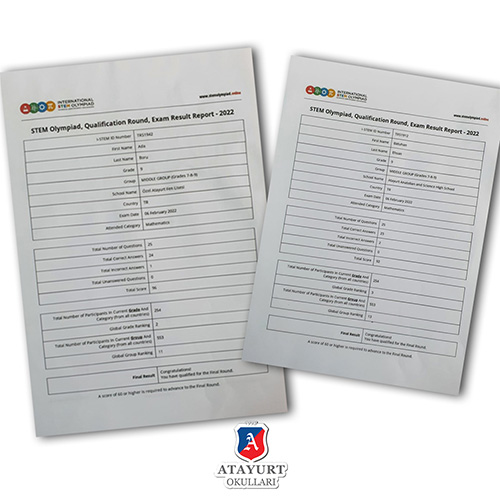 ÖZEL ATAYURT ANADOLU/FEN LİSELİ GENÇLER ULUSLARARASI I-STEM OLİMPİYATLARINDA ULUSLAR ARASI FİNALLERDE